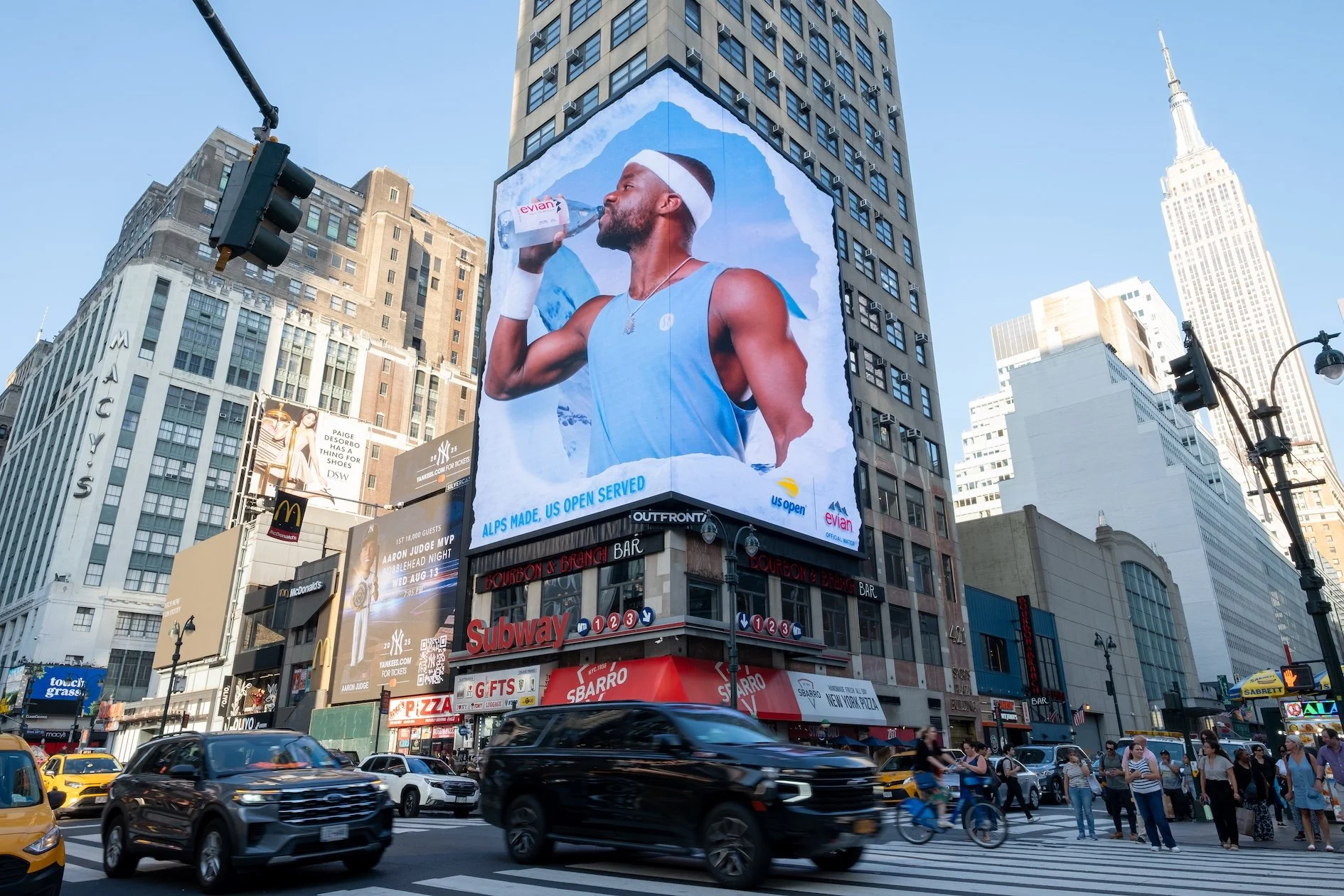The flagship execution ran on massive digital display near Penn Station, one of the busiest gateways for fans heading to the US Open. Surrounding Outfront and JCDecaux screens extended the campaign with anamorphic illusions, wrapping the plaza in an immersive storytelling environment that merged evian’s Alpine heritage with Tiafoe’s unstoppable energy.